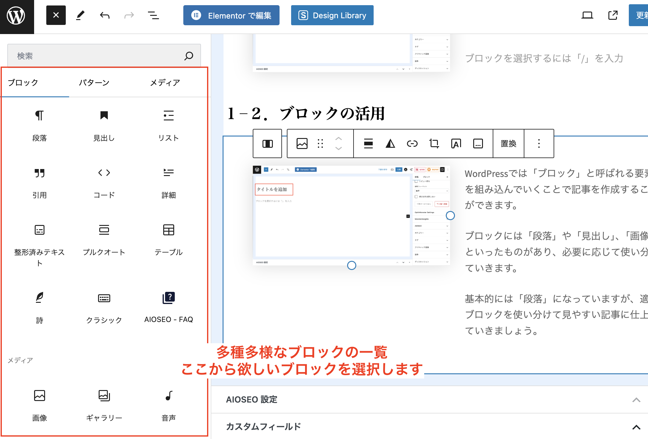 ブロックには「段落」や「見出し」、「画像」といったものがあり、必要に応じて使い分けていきます。