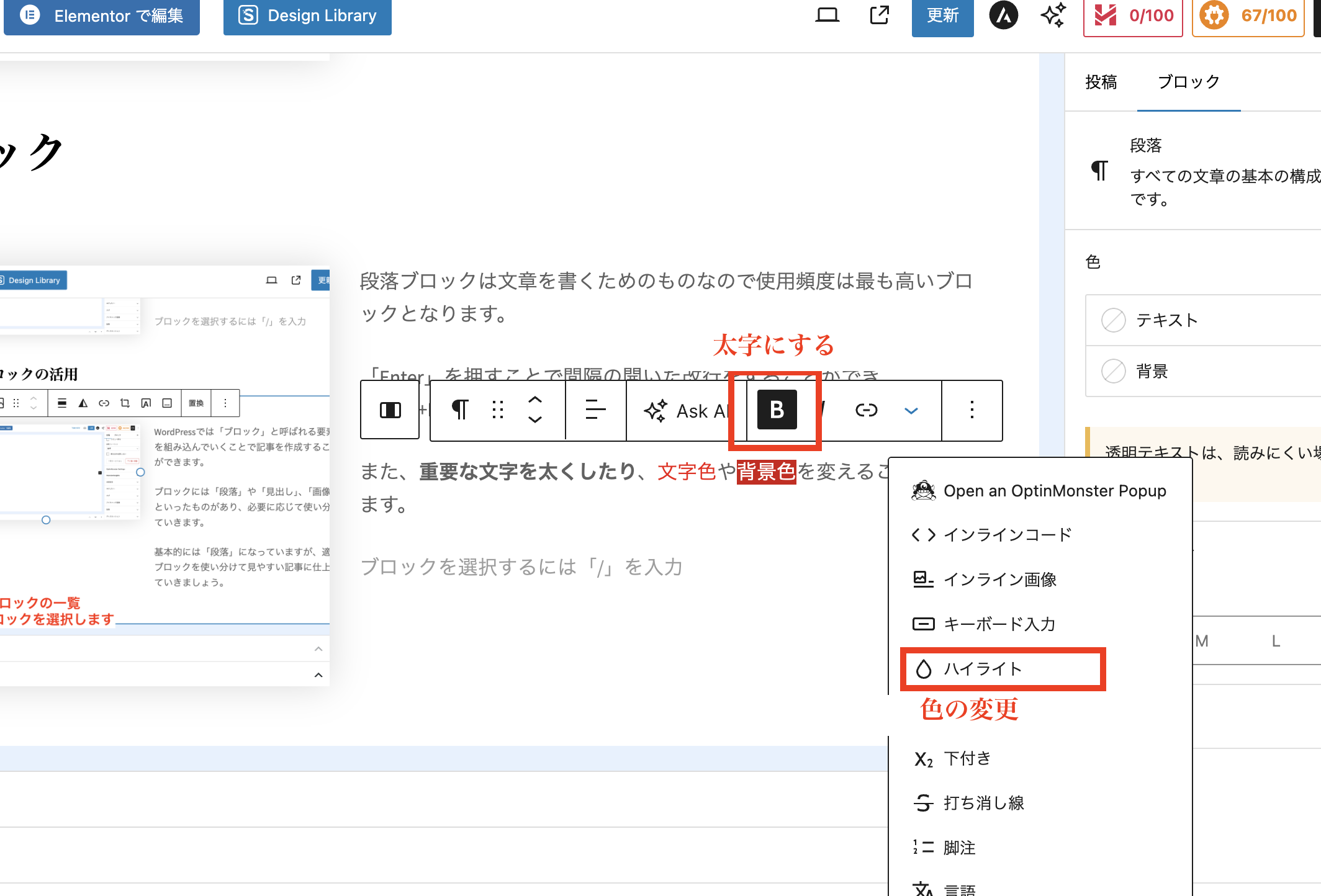 また、重要な文字を太くしたり文字色背景色を変えることもできます。
